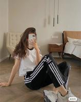 除了糖果色T恤,当然也少不了缤纷色系运动长裤啦!另一经典款三杆长裤同样除了百搭黑白色系外,洋溢着元气质感的淡黄色调也是时尚小姐姐们人手一件的必备裤款!