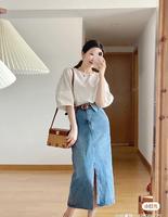 清爽简约的通勤穿搭,宽袖可以很好的遮手臂肉肉,略宽却不会低的领口可以修饰脸型,再加上小腿长裙也做开衩的设计,将上衣扎进长裙中,让身材比例更好