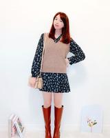 学院文青女孩可以参考这套,将短版针织背心套在洋装外,做出两件式穿搭,就能穿出学院文青感了,这样穿不但修饰身形,还青春无敌! 配件可以选择和背心颜色相近的长靴和小方包,咖啡色皮质长靴可以带出俐落感,奶茶色麂皮小方包可以制造柔和氛围。