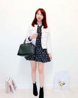 碎花洋装走个性风也很可以!微凉的天搭皮外套、锯齿厚底长靴,就能将甜美转为个性风了,甘辛mix一点也不突兀!想要更加帅气,所以外套和靴子都选黑色的,如果喜欢秀气一点也可以穿白色系、粉色系的皮外套。 包包刻意挑选咖啡色的,让颜色跳脱开,才不会整片黑噜噜,如果喜欢更有春意也可以背其他颜色的包包。
