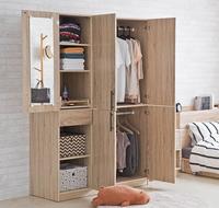 这个五门的衣橱实用度超级高,内附的其中一格有抽盘和抽屉,打开来也还有一个镜子,如果没有空间添置化妆桌的话,这个格子就可以放置化妆品或是日常保养品!另外有上下两格吊杆可以挂衣服,这样的设计让你可以依据季节来分类衣服喔!