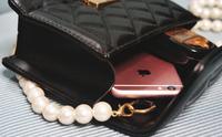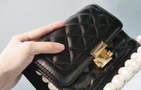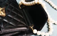 这款小包的设计是经典不败的格菱纹,材质是PU皮革,珍珠背带是温润的白色,背带设计是可以拆卸的,不过没办法调整背带长度。