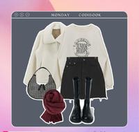 休闲的大学T加上毛毛外套跟黑短裙,最后用黑皮靴跟酒红色围巾点缀,大学生穿也不浮夸的跨年派对穿搭!