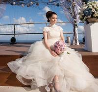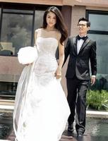 在《孤味》中有好表现的徐若瑄,选择了VeraWang的高领白色古典蕾丝婚纱,很符合她温柔婉约的形象。