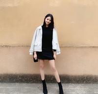 全身:绒布短裙+坑条针织打底衣+毛呢外套+袜靴,这套贴身黑色系穿搭,是成熟性感味的展现!