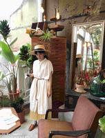 长版宽松白衬衫以及黄色百褶裙都是Uniqlo