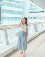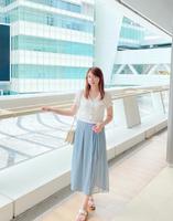 这款灰蓝色雪纺宽裤今年有好多卖家带,它是宽裤喔~只是其中一边多车了一片布,让它看起来像裙子。其中一边的裤管有百褶设计,另一边是平整的,加上蝴蝶结绑带,让它非常有设计感。内里只做到大腿的一半,让小腿若隐若现,小小的性感风是它的小心机:)