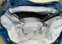 袋子是抽绳束口设计,这样的设计不只比拉链方便,还能兼顾防盗作用,包包容量运用上也更弹性。包包内只有一个内袋,而且是网状半透明的设计,这样在找东西的时候更方便。