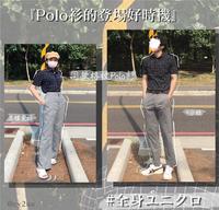 深蓝色底,淡黄格纹的Polo衫意外地吸睛。
