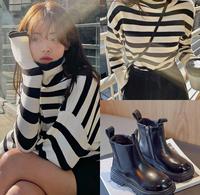 条纹套头上衣,又韩系又慵懒,让穿上它的人就像冬日的暖阳,又暖又甜,配上复古灯芯绒短裤,再加上切尔西靴,有点慵懒又有点元气