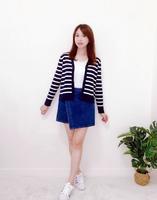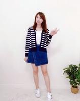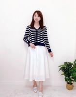 针织外套最让人欣赏之处在於多穿法~可当小外套、披肩,也可全扣当上衣~当上衣时扣子变成中排扣,有重点又能集中视线,让显瘦效果更好。这款的横条宽度计算得刚刚好~过细会让人眼花撩乱,过粗会显胖,它都不会。刚刚好的长度即使搭长裙也很OK,虽然是微宽版的,但仍有腰身,比例不错。海军蓝x白的配色很清爽,搭配白色圆裙、跟鞋,就能做出知性小姊姊的秋季好感穿搭啦。