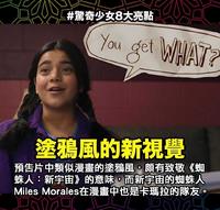 首支预告片中另一个吸睛亮点是漫画一般的对话框。虽然这对漫威宇宙的核心影迷来说并不陌生——我们早在《蜘蛛人:新宇宙》就惊艳於这充满新生代视觉元素的全新体验了——更有趣的是新宇宙的蜘蛛人MilesMorales在漫画中,和卡玛拉同为「冠军小队」的成员,两位年轻英雄的塑造也可看出漫威力图贴近时下的年轻世代,并跳脱有色族裔的刻板印象塑造,向实际的多元社会取材,丰富了漫威的「多元宇宙」!