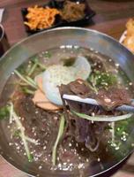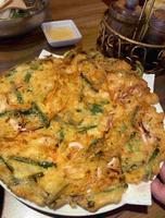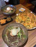 这次毅然决然的点了冷面和一个海鲜煎饼,冷面有分乾的和汤的,也可以做素食,当然也会附上几盘小菜,这是我第一次吃冷面,原来冷面的汤真的是冰的ㄟ,还有些许冰块,真的很适合大太阳天吃,爽口微酸甜的滋味,面条也是条条分明,滑顺入口,我觉得很适合搭配煎饼呢,看到隔壁桌也是跟我们点一模一样的搭配,不过他们好像是点泡菜煎饼。