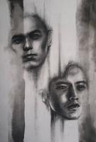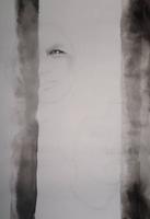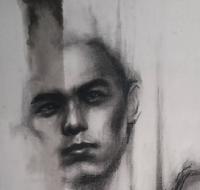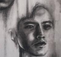 用炭精笔在眼窝处上碳粉,再用扁刷头水彩笔刷开,带到其他阴影的部位