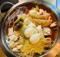 这是年糕锅,跟部队锅其实差不多,就里面一些料不太一样,有粉丝,炸海苔,蛋,跟两个煎饺,白菜,煎饺脆脆的满好吃的,因为前面点了煎饼,导致我们这锅还吃不太下,打包带走,结果隔天便当用剩下的酱汁跟料自己再加乌龙面,绝配,等於一餐吃了四人份