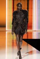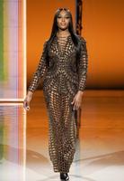 提到重量级模特儿,身上穿的服装当然也不能马虎,最后一系列几乎可以媲美高级订制服。此系列开场模特儿当然要由气势强压众人的NaomiCampbell担任,而且她还是自己先走完,后面才紧接她的乾女儿AdutAkech。